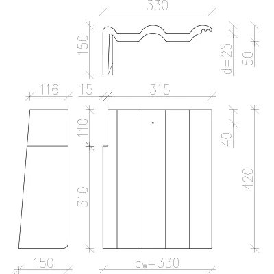 | Konstrukční krycí šířka | (počet tašek v řadě x 300) + 290 + 260 |